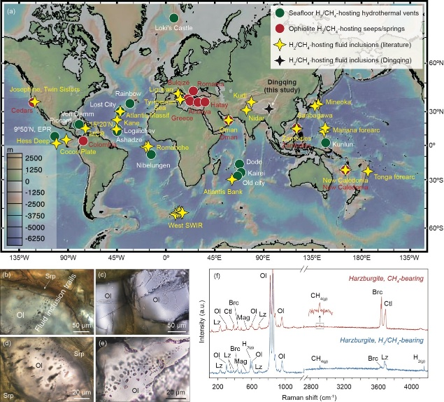 寻找和利用清洁能源是推动能源转型、应对气候变化的核心路径。其中,地质成因的天然氢气因具备“零碳排、低成本”的潜力,已成为全球能源竞争的新焦点。该研究的关键证据,来自保存在地幔橄榄石矿物中、仅微米大小的流体包裹体。通过精密仪器分析,科学家在这些包裹体中检测到了氢气与甲烷,并发现它们与典型的蛇纹石化蚀变矿物共生。这直接证明,青藏高原地下正在发生或已经发生“蛇纹石化”产氢过程——这是地球上最重要的天然氢气生成机制。